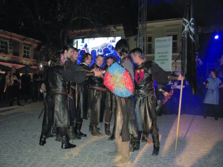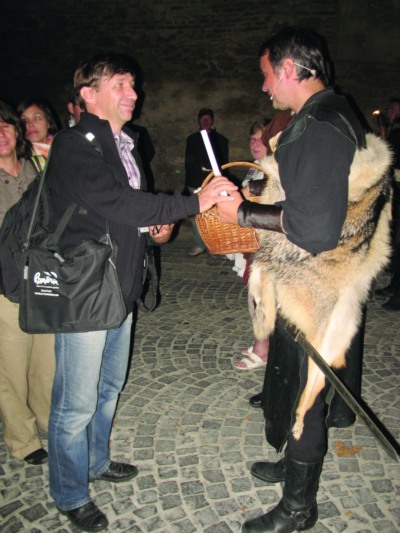 Îmbrăcaţi în costume de epocă, tineri entuziaşti ne-a dăruit două coliere – cu capul lupului dacic (Dacus Lupus), respectiv cu o potocoavă şi o căpăţână de usturoi -, menite să ne poarte noroc şi, fireşte, să ne păzească de spiritele rele. Atmosfera i-a pătruns pe toţi invitaţii care a doua după-amiază au fost martorii unui spectacol unic. El a fost promovat de aceeaşi trupă a artistică a Asociaţiei „Ordinului cavalerilor lup”, condusă de Liviu Pancu. Regizor şi actor la Teatrul Naţional din Târgu Mureş, loc de unde-şi trage seva şi inimoasa echipă, Pancu este în acelaşi timp şi iniţiatorul teatrului particular “Scena”. Spectacolul a adus în faţa jurnaliştilor de travel, copiii de la Ansamblul local “Plaiurile Ardealului”, condus de Viorel Răduţ. Lor li s-au alăturat cu recitaluri excepţionale maeştrii Dumitru Fărcaş, Gheorghe Turda, Ion Lăceanu, Leontina Pop, dar şi interpreţii Aurel Tamaş şi Ionuţ Fulea. Invitaţii au savurat, într-un mod aparte, melodiile interpretate de Ion Lăceanu la… frunză. Nu cea din campania turistică, ci frunze naturale din… Grădina Carpaţilor. “Ordinul cavalerilor lupi” a învins în finalul spectacolului atât dragonul cât şi spiritele malefice, iar Dracula s-a retras în lumea poveştilor recreate de noile generaţii de artişti… medievali. Evenimentele au avut sare, piper şi toate ingredientele necesare unui succes artistic.