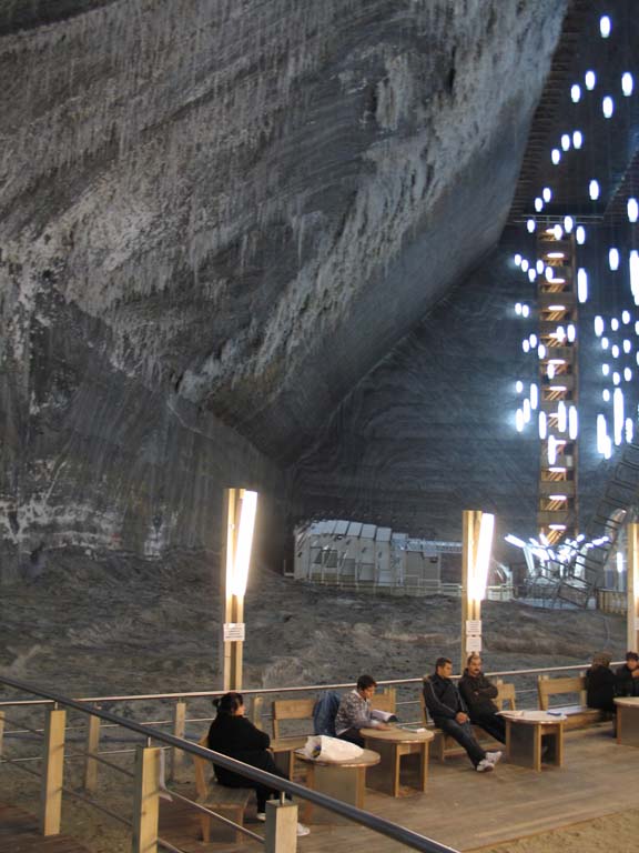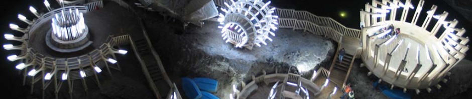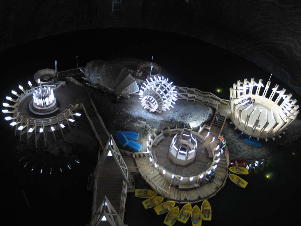 Şocul viitorului vă întâmpină însă în marele palat subteran, unde puteţi călători cu două lifturi moderne ce fac şi ele parte din scenariul SF. Aici Salina Turda are amenajate săli de tratament, un amfiteatru pentru spectacole – cele ale unor formaţii simfonice ori vocale rămân memorabile -, săli de sport, dar surpriză şi o roată panoramică cu gondole, produsă în Ungaria, de unde puteţi admira stalactitele din sare. Este singura roată de acest gen montată în subteran. La fel de trendy este şi o… plimbare cu barca din fibră de sticlă, la 150 de metri în subteran, pe lacul cu o salinitate suprasaturată, a cărui apă s-a dovedit la fel de valoroasă pentru tratament. Ca să treceţi prin această aventură trebuie să urmaţi instrucţiunile necesare şi să vă protejaţi capul cu o cască „inginerească”. Este obligatoriu să te echipezi ca să poţi evita eventuale căderi de stalactite şi… de droburi de sare. Ei, nu-i chiar aşa de periculos ! Dar paza bună trece primejdia rea. Ca să fim sinceri, cele mai căutate de vizitatori sunt cele două lifturi, unicate probabil în Europa şi în lume, care îţi oferă panorame şi unghiuri senzaţionale pentru a efectua fotografii inedite. Au fost comandate şi produse în Spania. Salina Turda este un loc care pare că ţi se oferă firesc, natural. Această atmosferă au dorit cu siguranţă să creeze promotorii proiectului ambiental. După cum ne spunea însoţitorul nostru în 2010 Salina a primit circa 400.000 de vizitatori, iar anul trecut numărul lor s-a apropiat de 350.000. Aşa stând lucrurile, poate credeţi la întoarcere spre ieşire că aţi văzut tot. Dar, surpriză într-un spaţiu special amenajat aveţi ocazia să vă completaţi cultura cu alte date interesante despre istoria