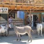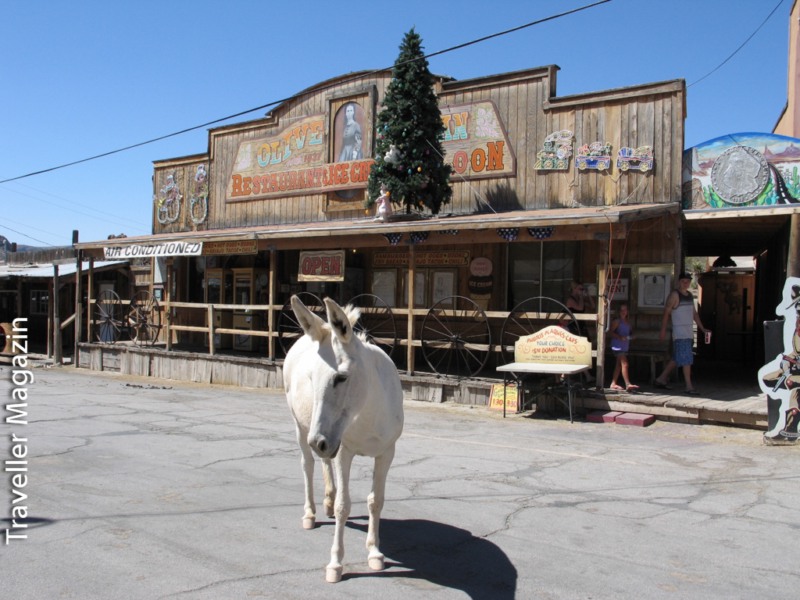 Noi am ales să mergem în locul unde măgarii se bucură de cel mai mare respect. Sunt vedete de zeci de ani iar acest statut a fost cultivat de primăria Oatman. Am apelat la cei mai buni în domeniul tururilor turistice – Laughlin Adventure Tour. Și împreună cu ei am căutat să aflăm de ce este atât de celebră această așezare minieră, prosperă cândva, aflată pe originala și bătrâna Route 66. Azi nu mai e celebră prin zăcamintele ci prin armata de… măgari care trăiesc sălbatici, și coboară în fiecare zi, în centru orașului pentru a lua… masa. Ei s-au obișnuit să coboare zilnic din dealurile aride ale deșertului și să se plimbe agale pe străzile orașului. Îi vezi peste tot căutând hrana pe care turiștii (prin grija autorităților locale), le-o asigură din plin. Toate magazine pline cu suveniruri marca ”Route 66” și măgarii comunitari au la intrare pungi cu hrană pentru acești locuitori speciali. ! Un dolar punga. Și tot la intrare se află bucăți mari de sare.