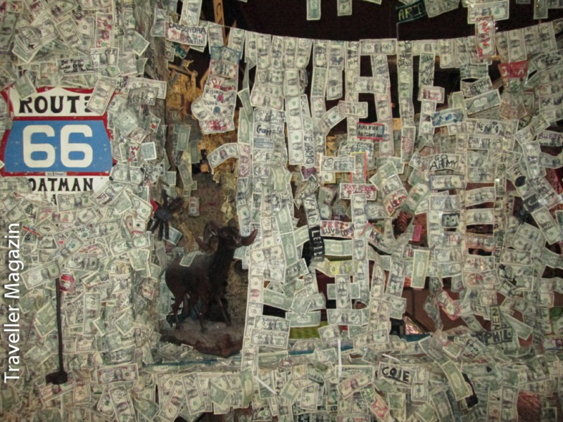 Oatman a luat ființă în 1906 când explodase goana după aur în El Dorado. Pe vremurile prospere au fost câteva zeci de mii căutători de aur, care și-au încercat norocul. Azi așezarea mai numără doar… 25 de locuitori. Care s-au convertit la turism. Și începuturile cinematografiei americane sunt legate de Oatman. Nu întâmplător cei mai celebri actori care au lăsat amintiri în zonă sunt Clark Gable și soția sa Carole Lombard, care și-au petrecut luna de miere în… luxosul hotel din centru. Azi este amenajat ca muzeu și se află în plin proces de… personalizare. Cea mai tare atracție a sa este restaurantul de… 1 milion de dolari. Pe bune. Barul, scena, unde se produc zilnic concerte live cu muzică country, salonul principal, toate sunt îmbrăcate de la podea până pe tavane cu bancnote de 1, 5, 10 ori 20 de dolari, pe care turiștii trecuți pe aici și-au scris numele și un mesaj. Când intri rămâi șocat de ceea ce vezi. O extravaganță ? Nicidecum. E o comoară creată de localnici mineri și, mai recent, de cei care vin aici atrași de faima măgarilor.