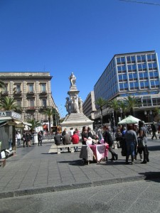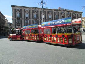 Vă faceți griji că n-o să vă ajungă timpul să le vizitați pe toate? Chiar pe Via Vittorio Emanuele într-un colț al pieții centrale se bat pe clienți în fiecare zi două vehiculele a două City Tour-uri, care costă invariabil doar 5 euro de persoană. Cu primul, autobuzul supraetajat, aveți ocazia să faceți marele circuit al orașului modern, să străbateți bulevarde, să vă încântați ochii cu fântâni și sculpturi clasice. Firește, puteți coborî oriunde vă place, căci tichetul este valabil o zi întreagă. Ghidajul este asigurat în 5 limbi așa că veți deveni tobă de istorie și cultură italiană. La fel se întâmplă și cu Trenulețul turistic. O ia la vale și la deal pe străduțe înguste accesibile în principal pietonilor. Din acest vehicul nu prea ai unde să te dai jos pentru că spațiile sunt foarte strânse iar dacă vreți și adrenalină o s-o aveți din plin mai ales la intersecții și luatul curbelor. Nu ratați și spectacolul așaziselor certuri dintre șoferi care, chipurile se luptă pentru a convinge turiștii să urce mai întâi în mijlocul lor de transport. Comedia dell arte, comedia dell turismo, nu contează, e doar un spectacol de care se bucură toată lumea într-o zi însorită de primăvară. Profitați din plin de ofertă. Înainte, între tururi, sau după aceea, nu ratați un capucino la una din multele terase din Piața Domului. Ca din întâmplare un băiat de prăvălie, uneori chiar un român, îi dă drumul la povestea cu micul elefant din Piața Domului, cocoțat pe un piedestal, ce ține în spate un obelisc egiptean. Statueta acestuia are peste două mii de ani vechime și provine dintr-un templu oriental. Povestea amintește că magul Eliodor l-ar fi călărit în lupta sa împotriva sfântului episcop Leon, în care a fost înfrânt. Statuia micului pachiderm a fost găsită și recuperată de către arhitectul Vaccarini prin anii 1700. Inspirat de Fântână lui Bernini de la Roma el a creat la rândul său o fântână ce domină Piața Domului. În centrul ei se află coloana și elefantul respectiv, devenit emblemă dar și loc de referință pentru întâlnirea îndrăgostiților.