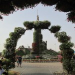 Încă de la intrare pătrunzi în spațiul unui basm căci accesul se face prin miezul unei uriașe orhidee-poartă. Și de aici te scurgi, la propriu și la figurat, pe aleile poveștilor. Zâna cea bună te întâmpina cu apă răcoroasă curgându-i printre degete, inimi din arcade florale îți oferă umbra necesară, băcuțe cu forme delicate (păuni, lebede, flori) îți oferă loc de repaos. Aleile sunt flancate de valuri de flori ce ai senzația că se scurg pe lângă tine. O arhitectură vegetală te înconjoară în fiecare sector. În centrul grădinii domină, cum altfel, silueta celebrului Burj Al Khalifa, o ”miniatură” de numai… 21 de metri. Alături se distinge ușor Turnul Eiffel, încadrat de numeroase mori de vânt care par că sunt gata să se învârtă. Nu lipsesc castele englezești, scoțiene, galeze, pagodele nipone, palate, peisaje cu vile montane desprinse parcă din mici stațiuni din Alpii francezi ori elvețieni. Atmosfera medievală este întărită de uși străjuite de… ghivece pline de flori. Iar dacă nu ști cât este ora florile unui ceas imens îți indică timpul rămas până la închidere. Cascade de ape florale îți desfată mirosul iar dacă ești prea stors de soare te poți răsfăța cu o plimbare prin tunelul construit din umbrele multicolore. Puțin mai departe te poți opri la o cafea sau o răcoritoare, la cofertăria Miracle Garden, al cărui acoperiș protector este alcătuit dintr-o pepinieră de flori și ghivece. Aici sunt rezervele florale ce înlocuiesc permanent aranjamentele uscate de furtunile de nisip ori vântul deșertului. Pe terasă poți savura și o salată de fructe pe care ți-o poți face singur, din ceea ce ai la îndemână, căci aici există un spațiu special unde poți învăța și interacționa cu plantele !